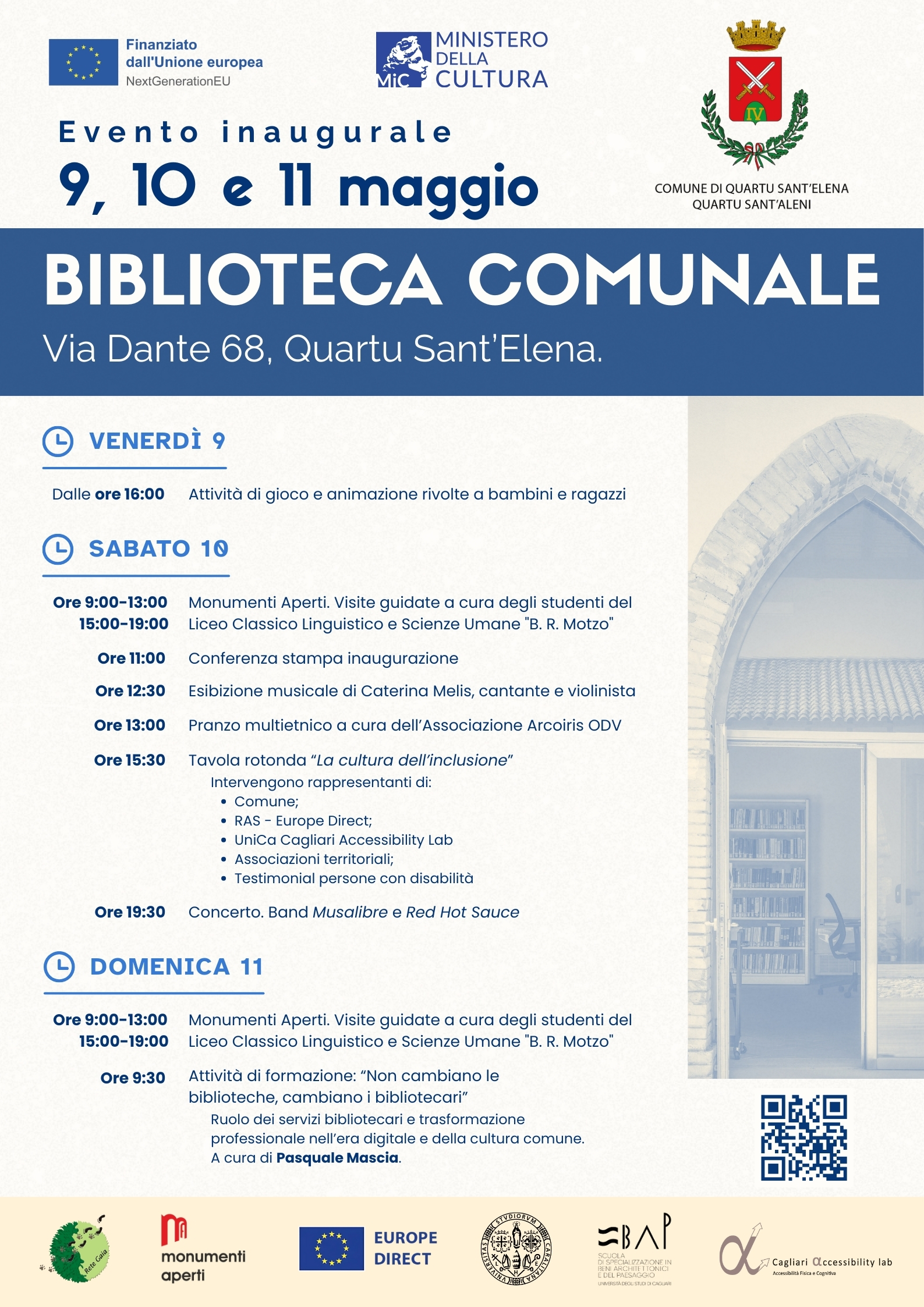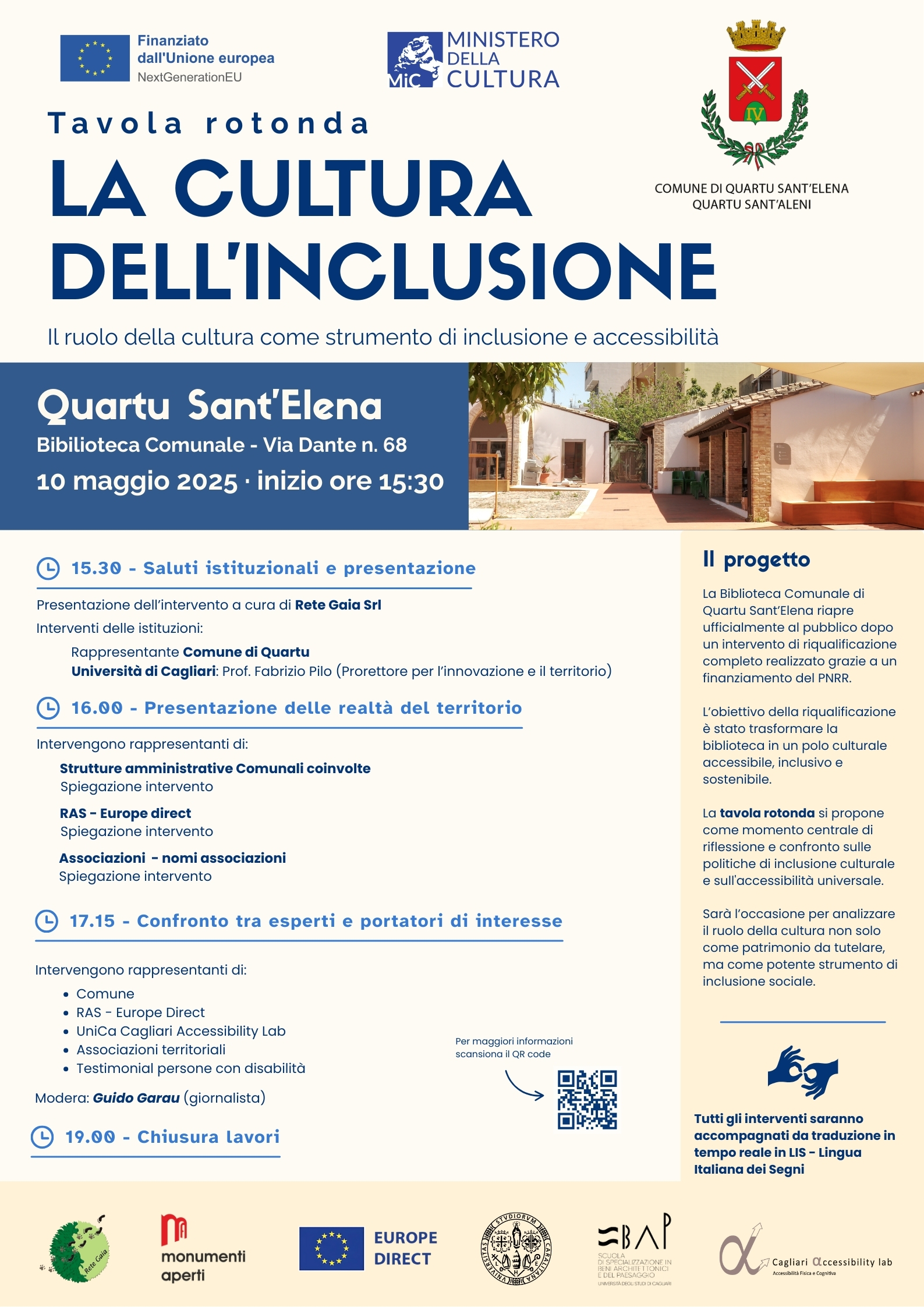La Biblioteca comunale di Quartu Sant’Elena riapre ufficialmente al pubblico dopo un intervento di riqualificazione completo realizzato grazie a un finanziamento del PNRR. L’obiettivo della riqualificazione è stato trasformare la biblioteca in un polo culturale accessibile, inclusivo e sostenibile. La tavola rotonda si propone come momento centrale di riflessione e confronto sulle politiche di inclusione culturale e sull'accessibilità universale. Sarà l’occasione per analizzare il ruolo della cultura non solo come patrimonio da tutelare, ma come potente strumento di inclusione sociale.