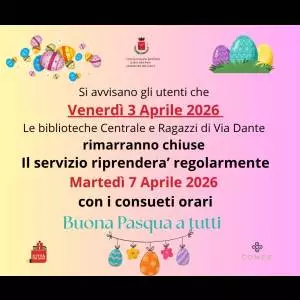 Chiusura delle Biblioteche di via Dante Centrale e Ragazzi venerdì 3 aprile 2026 in occasione delle festività pasquali