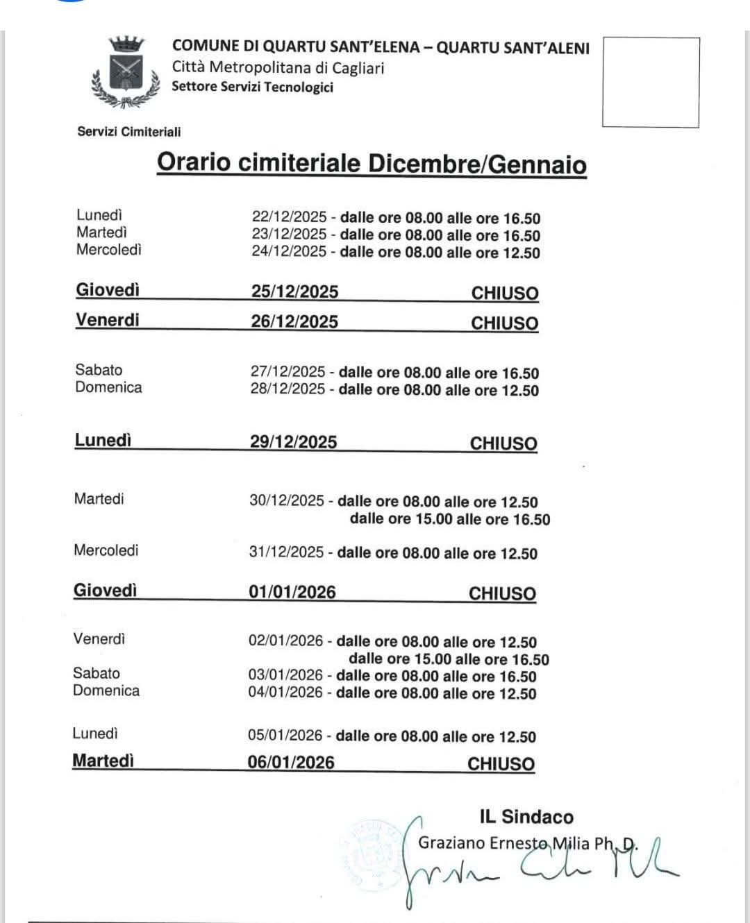 Si informa la cittadinanza che in occasione delle festività di fine anno gli orari e le aperture del Cimitero subiranno alcune variazioni.