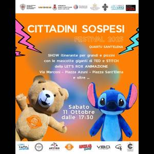 CITTADINI SOSPESI 2025 è un festival letterario e di commistione fra le arti: la scrittura incontra la musica, il teatro, le arti performative, figurative, multimediali. Dato il successo degli scorsi anni (ricordiamo che la prima edizione di Cittadini Sospesi risale al 2014 al Teatro Sant’Eulalia in Cagliari) viene riproposta con un ciclo di 7 incontri, inclusi nelle attività di “Quartu Estate 2025 Ripensare la e le città”, ecco gli ultimi tre: sabato 11 ottobre 2025 alle ore 17:30 vedrà lo show itinerante per grandi e piccini con le mascotte giganti di TED & STITCH a cura di Let’s Rox Animazione, che gireranno nella via Marconi, nella piazza Azuni, nella piazza Sant’Elena e oltre.