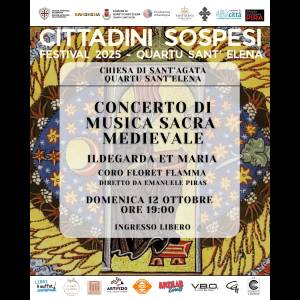 Nell’appuntamento di domenica 12 ottobre alle 19:00 avremo il Concerto di musica sacra medievale “ILDEGARDA ET MARIA” con il coro FLORET FLAMMA diretto da EMANUELE PIRAS presso la chiesa di Sant’Agata.