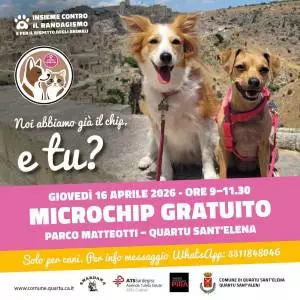 A queste iniziative si aggiunge il primo appuntamento del 2026 con il Microchip Day, in programma giovedì 16 aprile dalle ore 9.00 alle 11.30 presso il Parco Matteotti. Grazie alla collaborazione con il servizio veterinario di Cagliari, con gli operatori di Shardana e con i volontari del territorio, sarà possibile applicare il microchip ai cagnolini e iscriverli contestualmente iscriverli all’anagrafe canina. All’iniziativa saranno presenti anche la Garante comunale degli animali Donatella Perseo e le Guardie Zoofile OIPA Cagliari.