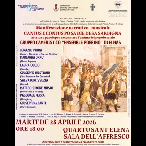 In occasione de Sa Die de sa Sardigna, il Comune di Quartu Sant’Elena propone lo spettacolo “Cantus e contus po Sa Die de sa Sardigna”, in programma il 28 aprile 2026 alle ore 18.00 presso la Sala dell’Affresco dell’Ex Convento dei Cappuccini, in via Brigata Sassari 4, un evento narrativo-musicale interamente in lingua sarda, pensato per rendere omaggio alla memoria storica e culturale del popolo sardo.