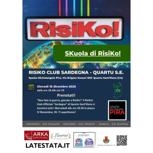 L’interesse di Quartu per il Risiko, uno dei giochi da tavola più noti e apprezzati in assoluto, si rinnova con un altro appuntamento, poco prima delle festività, promosso per affinare le proprie strategie: giovedì 18 dicembre p.v. alle 18 lo Spazio Michelangelo Pira di via Brigata Sassari ospiterà la SKuola di RisiKo!, organizzata dal RisiKo! Club Ufficiale ‘Sardegna’ di Quartu Sant'Elena, con il patrocinio del Comune di Quartu.