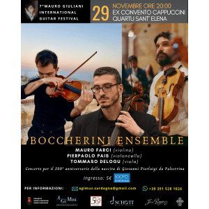 Sabato 29 novembre alle ore 20, presso la stessa sede, la serata sarà dedicata alla musica da camera, con il concerto dell’Ensemble Boccherini, trio d’archi formato da Mauro Farci (violino), Pierpaolo Pais (violoncello) e Tommaso Delogu (viola). Il trio offrirà un programma speciale in occasione del 500° anniversario della nascita di Giovanni Pierluigi da Palestrina, omaggiando il grande maestro della polifonia con opere di Schubert, Beethoven e Mozart.