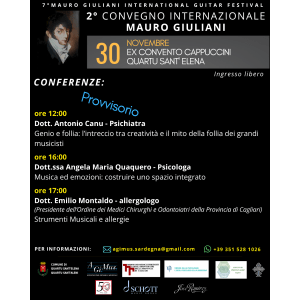 La settima edizione del Mauro Giuliani International Guitar Festival e il secondo Convegno Internazionale Mauro Giuliani sono in programma dal 28 al 30 novembre, con il patrocino del Comune di Quartu Sant’Elena. Verranno proposte una varietà di iniziative rivolte agli amanti della musica classica, agli studenti, ai musicisti e ai semplici curiosi. Non solo musica, il programma della manifestazione prevede un dialogo multidisciplinare che interessa anche la letteratura, la psicologia e la scienza.
