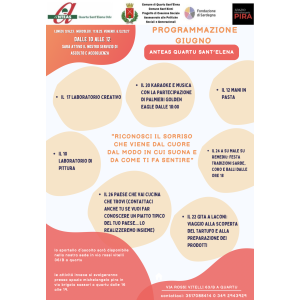 La famiglia Anteas di Quartu Sant’Elena, anche per il mese di giugno, propone un programma ricco di eventi. In collaborazione con i Servizi Sociali del Comune di Quartu Sant’Elena, nell’ambito dei progetti di Coesione Sociale, ti invita a partecipare alle seguenti iniziative che si terranno presso lo “Spazio Michelangelo Pira”, dalle ore 16:00 alle ore 19:00: