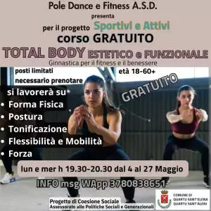 Le attività si svolgeranno presso la sede di via Beethoven 26 a Quartu Sant’Elena, secondo il seguente calendario: il corso di Total Body si terrà il lunedì e mercoledì dalle 19.30 alle 20.30, dal 4 al 27 maggio; il corso di Pole Dance il lunedì e mercoledì dalle 18.30 alle 19.30, dal 18 maggio al 17 giugno. L’iniziativa si concluderà sabato 20 giugno con un evento finale in programma dalle 17.30 alle 20.30.