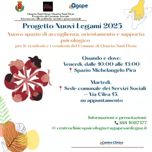 Nell’ambito del progetto di Coesione Sociale “Nuovi Legami 2025”, finanziato dal Comune di Quartu Sant’Elena, la Cooperativa Sociale Agape, con il suo Centro Clinico di Psicologia e Psicoterapia, attiva uno Sportello di consulenza e orientamento psicologico rivolto ad adolescenti, adulti e anziani residenti nel territorio comunale.