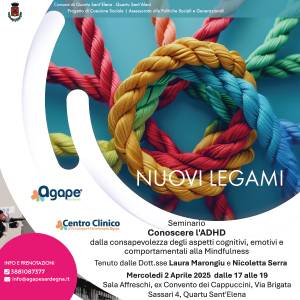 Il seminario dal titolo "Conoscere l'ADHD: dalla consapevolezza degli aspetti cognitivi, emotivi e comportamenti alla Mindfulness", rientra nell'ambito del più ampio programma 'Nuovi legami’, un progetto di coesione sociale finanziato dall’Amministrazione comunale con la supervisione dell’Assessorato ai Servizi sociali. L'evento sarà condotto dalle dottoresse Nicoletta Serra e Laura Marongiu del Centro Clinico di Psicologia e Psicoterapia Agape. Si parlerà di Disturbo da Deficit di Attenzione e Iperattività nei suoi aspetti emotivi, scolastici/lavorativi e relazionali.