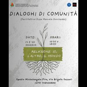 "Dialoghi di Comunità" organizzato dall'associazione Crif Cagliari presso lo Spazio Michelangelo Pira il 13 ed il 20 maggio alle 16,30 e alle 18,00.