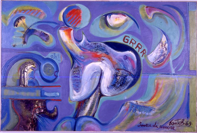 I tempi erano maturi, e quando a Cagliari incontrai Gaetano Brundu, già avanti nelle sue ricerche astratte, scoccò l’idea di un gruppo di giovani “ribelli”, come ci definì la stampa. Era il 1957 quando Primo Pantoli appena venticinquenne approda in Sardegna, dopo gli studi a Firenze e Lucca, invitato dall’amico Marcello Lucarelli. Dagli anni di denuncia sociale contraddistinti da Studio 58, Gruppo di Iniziativa e Centro di Cultura democratica, l’artista concepisce una sorta d’ideologia per immagini di matrice Fauves e contaminazioni del più crudo espressionismo. Un esempio calzante è l’opera che apre il percorso della mostra descrivendo gli ultimi momenti in croce di Cristo quando a gran voce urlò: “Perché mi hai abbandonato?” Ossia Lamma Sabcthani (1958). Stessi presupposti per La Bestia (1961) opera fondata sull’erotismo, uno dei cardini della sua poetica, che arriva in risposta ai tabù dell’epoca. Esplicito atto d’accusa contro i falsi moralismi. Cerco solidarietà alla mia denuncia dello sfacelo che ci hanno creato attorno. Hanno inquinato perfino il sesso. Meno cupa e aggressiva è l’opera di passaggio Grrr invece di amore (1969), ispiratrice del titolo della mostra. É in questo frangente che la forma perde di consistenza fino scomporsi e galleggiare nell’atmosfera. Mentre ai colori brillanti associa i primi interventi didascalici. La pittura mi serve per gridare, amava ripetere.