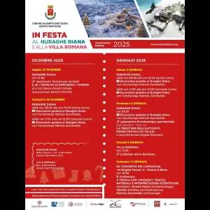 Il calendario prende avvio sabato 27 dicembre 2025 al Nuraghe Diana con lo spettacolo teatrale per bambini E se i topolini scoprissero i tombini, di e con Marta Proietti Orzella dell’Associazione Abaco Teatro, in programma alle ore 10.30. Domenica 28 dicembre sono previste due escursioni guidate al Nuraghe Diana, dalle ore 9.45 alle 10.45 e dalle ore 11.00 alle 12.00, condotte dall’archeologa Patrizia Zuncheddu.