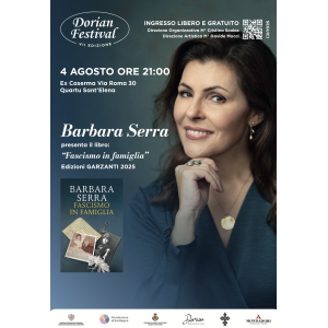 Lunedì 4 agosto alle ore 21, sempre all’Ex Caserma di via Roma 30, sarà la volta di Barbara Serra. La giornalista presenterà il libro “Fascismo in famiglia” (Ed. Garzanti 2025). È il racconto di un viaggio nella memoria tra storia personale e collettiva: partendo da una lettera ritrovata per caso, l’autrice ricostruisce la complessa vicenda del nonno Vitale Spiga durante il regime.