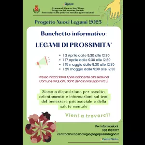 In Piazza XXVIII Aprile, nelle vicinanze del Comune di Quartu Sant’Elena, sarà presente il banchetto informativo “Legami di prossimità”, curato dalla Cooperativa Agape attraverso il Centro Clinico Psicologia Agape, nell’ambito del progetto di coesione sociale “Nuovi Legami 2025”, promosso e finanziato dal Comune.