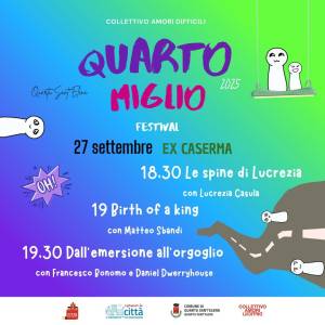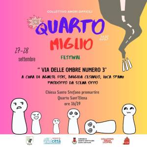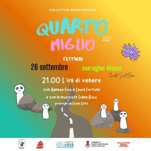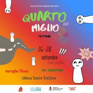 Un festival di teatro, scrittura e arti performative, inserito all’interno della rassegna Ripensare la Città, che anche quest’anno, con il contributo delle associazioni, propone un lungo cartellone di spettacoli e iniziative in centro città e nel litorale di Quartu. Organizzato dal Collettivo Amori Difficili, Quarto Miglio porta dal 2023 a Quartu Sant’Elena il linguaggio del teatro, della scrittura e delle arti performative come strumento di dialogo e partecipazione.