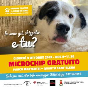 Nell'ambito della campagna di prevenzione contro il randagismo e il benessere animale l'Amministrazione comunale ha programmmato un altro Microchip-Day per Giovedì 9 ottobre 2025, dalle ore 9.00 alle ore 11.30, nel Parco Matteotti, lato dell'Ex Convento dei Cappuccini. Il servizio è completamente gratuito.