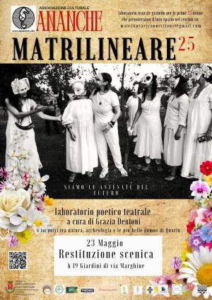Il percorso poetico teatrale ispirato alla Dea Madre ideato e realizzato da Grazia Dentoni e presentato nella cornice Teatri di Pace dall’associazione culturale Ananché, si appresta a rendere i suoi esiti al pubblico con la performance Matrilineare 25, in programma venerdì 23 maggio alle ore 19:00 a Quartu Sant’Elena, presso i Giardini di via Marghine (fronte Tennis Club Costa di Sopra), dove contemporaneamente inaugura, con la prima semina, l'orto per disabili creato da Maurizio Camba.