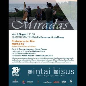 La quarta edizione di Pintai bisus giungerà al termine venerdì 6 giugno, con un ultimo appuntamento all'ex Caserma di via Roma, che si collega idealmente alle prossime tappe del ricco calendario di Mare e Miniere. In programma, sempre con inizio alle 21, la proiezione del docufilm "Miradas", una raccolta di sguardi – come suggerisce il termine in lingua sarda – su volti, luoghi ed emozioni che in oltre dieci anni hanno segnato il cammino di Mare e Miniere, la rassegna itinerante dedicata alla musica, al teatro e alla danza di tradizione popolare, attiva tra la primavera e l'autunno in diversi centri della Sardegna. Nata nel 2006, la manifestazione è frutto della passione e dell'esperienza di due figure di riferimento nel panorama musicale isolano come Elena Ledda e Mauro Palmas.