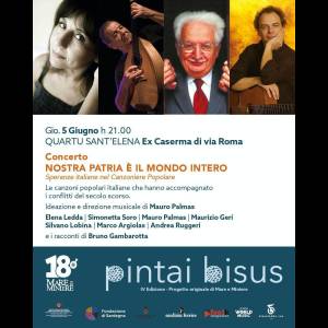 Seconda e conclusiva tranche di Pintai bisus, questo fine settimana a Quartu Sant'Elena. La rassegna promossa dall'associazione Elenaledda Vox con il sostegno dell'Amministrazione Comunale, e inserita nell'ampia proposta culturale di Mare e Miniere, completa la sua quarta edizione con due nuove serate all'ex Caserma di via Roma. La prima riprende il filo rosso che ha legato gli appuntamenti della settimana scorsa, il tema della guerra, trattato attraverso la mostra fotografica di Salvatore Ligios "Bello è morire per la Patria. Paesaggi e identità", nel reading poetico-musicale dedicato ai poeti di guerra italiani dell'attrice e cantante Simonetta Soro con le musiche di Arrogalla, e nell'incontro con la filosofa Roberta De Monticelli e il suo saggio "Umanità violata. La Palestina e l'inferno della ragione": proseguendo questo percorso, domani (giovedì 5 giugno), alle 21, spazio dunque a "Nostra patria è il mondo intero", un concerto che nel sottotitolo, "Speranze italiane nel Canzoniere Popolare", chiarisce subito l'ispirazione e le finalità del progetto ideato e diretto da Mauro Palmas, musicista e compositore di primo piano della scena musicale sarda. Il concerto vedrà protagoniste le voci di Elena Ledda e Simonetta Soro, altri nomi di spicco della musica isolana, accompagnate da un ensemble strumentale composto da Marco Argiolas al clarinetto, Maurizio Geri alla chitarra, Silvano Lobina al basso, Andrea Ruggeri alle percussioni, con lo stesso Palmas al liuto cantabile e alla mandola.