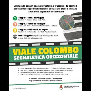Conclusi nei tempi previsti i lavori di scarificazione e conseguente posa in opera dell’asfalto, e trascorsi 10 giorni per l’assestamento del bitume, in viale Colombo il prossimo step interessa la segnaletica orizzontale, che sarà tracciata dal 7 all’11 luglio. Anche questo intervento sarà effettuato durante la notte e suddiviso in 3 tappe, per garantire massima rapidità d’esecuzione e non intralciare il traffico negli orari diurni.