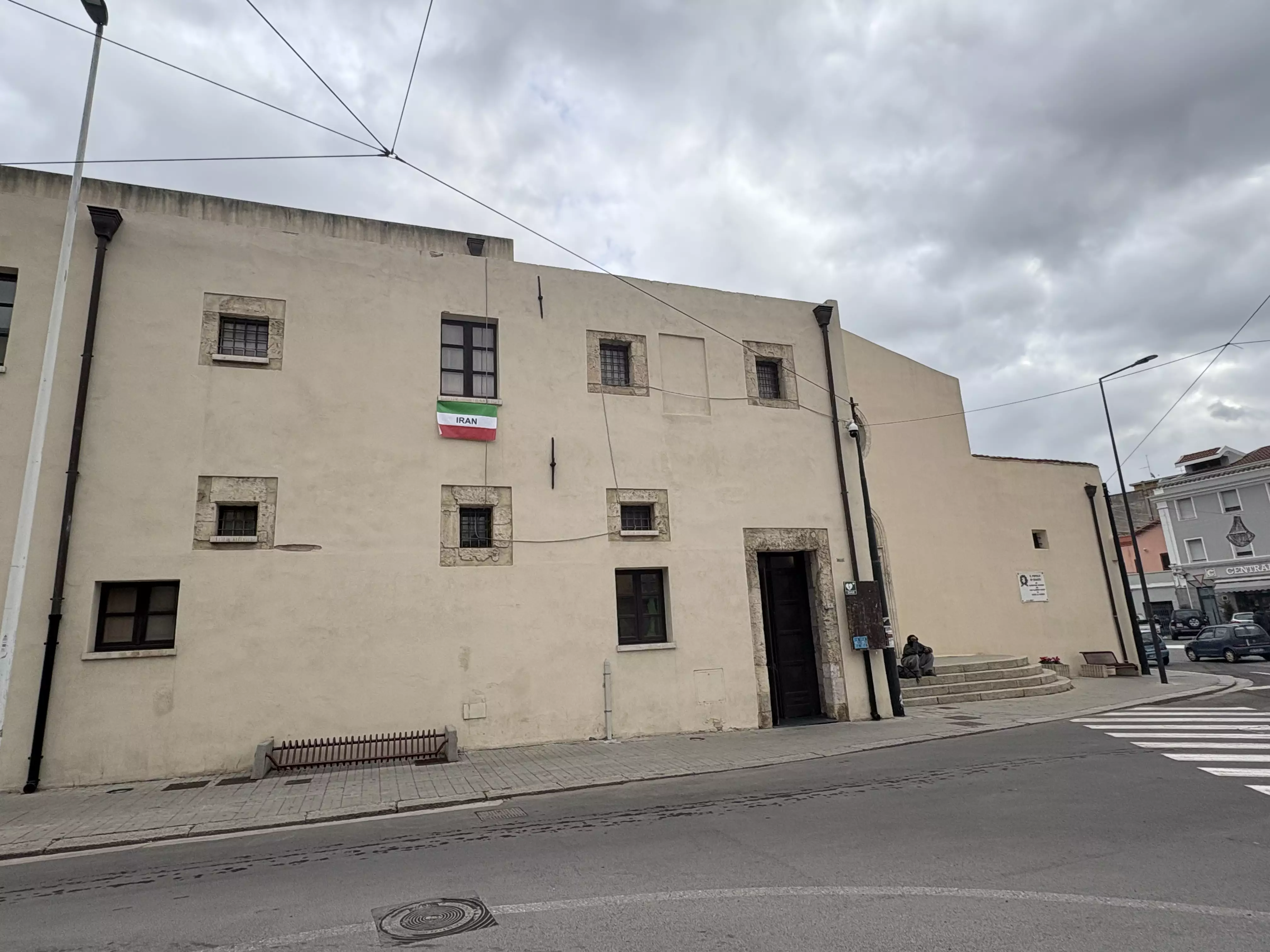 La stendardo esposto nella facciata dello storico edificio di via Brigata Sassari, sede istituzionale del Sindaco, è la variante non ufficiale della bandiera iraniana utilizzata da diversi manifestanti, con le tre bande orizzontali verde, bianco e rosso e la scritta ‘Iran’ al centro. Il vessillo esprime distacco sia dal passato monarchico dello Scià (stesse bande e stessi colori ma al posto della scritta un’immagine del leone e del sole) sia dal presente teocratico (stesse bande e stessi colori ma al posto della scritta l’emblema di Allah stilizzato), proponendo così un’identità iraniana neutra, laica e unitaria.