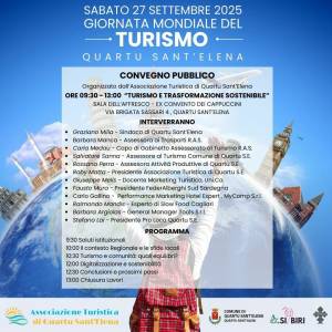 ‘Turismo e trasformazione sostenibile’ è in programma sabato 27 settembre p.v., in occasione della Giornata Mondiale del Turismo, presso la Sala dell’Affresco dell’Ex Convento dei Cappuccini, in via Brigata Sassari, 4. Alle 9.30 sono previsti i saluti istituzionali, poi via al dibattito che prevede dapprima un approfondimento sul contesto regionale e sulle sfide locali, quindi un focus sulla necessità di trovare un equilibrio tra turismo e comunità e infine un ragionamento su digitalizzazione e sostenibilità.