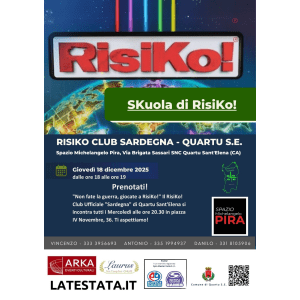 L’interesse di Quartu per il Risiko, uno dei giochi da tavola più noti e apprezzati in assoluto, si rinnova con un altro appuntamento, poco prima delle festività, promosso per affinare le proprie strategie: giovedì 18 dicembre p.v. alle 18 lo Spazio Michelangelo Pira di via Brigata Sassari ospiterà la SKuola di RisiKo!, organizzata dal RisiKo! Club Ufficiale ‘Sardegna’ di Quartu Sant'Elena, con il patrocinio del Comune di Quartu.