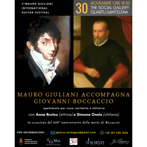 La manifestazione si chiuderà alle ore 19 presso The Social Gallery con lo spettacolo “Mauro Giuliani accompagna Giovanni Boccaccio”, che vedrà in scena l’attrice Anna Brotzu e il chitarrista Simone Onnis in un percorso evocativo tra letteratura e musica, ideato in occasione del 650° anniversario della morte di Boccaccio.