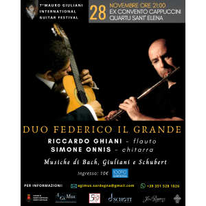 Il calendario dei concerti propone due appuntamenti di particolare fascino, entrambi ospitati nella suggestiva cornice dell’Ex Convento dei Cappuccini – Sala dell’Affresco, in via Brigata Sassari 4. La serata inaugurale, in programma venerdì 28 novembre alle ore 21, vede protagonista il duo Federico il grande, composto dal flautista Riccardo Ghiani, solista del Teatro Lirico di Cagliari, figura di spicco nel panorama flautistico internazionale, e il chitarrista Simone Onnis. Il Duo propone un raffinato repertorio con brani di Bach, Giuliani e Schubert, capace di valorizzare il brillante dialogo tra i due strumenti, attraverso l’interpretazione di due musicisti di grande spessore.