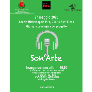 Lunedì 27 maggio, dalle ore 10:00 alle 17:00, presso lo Spazio Michelangelo Pira di Quartu Sant'Elena, sarà inaugurata l'installazione "Son'Arte", evento conclusivo di un percorso partecipativo e artistico promosso da Teatro Impossibile. Il progetto di Coesione Sociale realizzato grazie al contributo del Comune di Quartu Sant'Elena, Assessorato alle Politiche Sociali Generazionali in collaborazione con i Servizi Sociali, il Centro Salute Mentale cittadino e la Cooperativa Sociale Agape, ha coinvolto 40 persone in situazione di fragilità, che hanno lavorato per mesi alla costruzione di una narrazione collettiva e sonora della loro città.