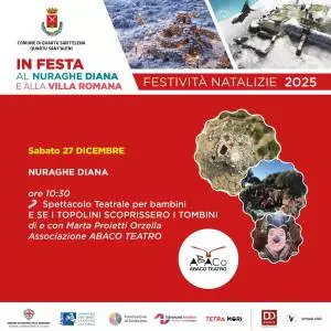 Il calendario prende avvio sabato 27 dicembre 2025 al Nuraghe Diana con lo spettacolo teatrale per bambini E se i topolini scoprissero i tombini, di e con Marta Proietti Orzella dell’Associazione Abaco Teatro, in programma alle ore 10.30. Domenica 28 dicembre sono previste due escursioni guidate al Nuraghe Diana, dalle ore 9.45 alle 10.45 e dalle ore 11.00 alle 12.00, condotte dall’archeologa Patrizia Zuncheddu.