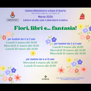Continuano nella Biblioteca dei Ragazzi di via Dante le iniziative rivolte ai più piccoli, con l’intento di avvicinarli alla lettura in modo coinvolgente e partecipato. Per l’intero mese di marzo il calendario propone letture ad alta voce e laboratori creativi dedicati al tema “Fiori, libri e… fantasia!”, un viaggio tra storie e attività manuali pensato per accendere immaginazione, curiosità e spirito di condivisione.