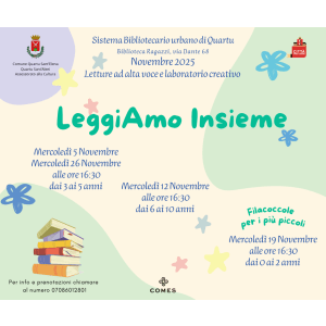 E a novembre proseguiranno anche le letture e i laboratori creativi promossi dal personale interno della Biblioteca in collaborazione con la Cooperativa Comes. Diversi gli appuntamenti programmati per il mercoledì, sempre alle 16.30, e suddivisi in base all’età dei giovanissimi quartesi amanti della letteratura e delle storie.