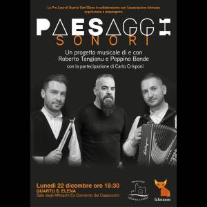 Paesaggi Sonori è un viaggio musicale che attraversa suoni, tradizioni e suggestioni della Sardegna, rielaborate in una chiave contemporanea. Il progetto unisce strumenti della tradizione e linguaggi moderni, dando vita a un racconto sonoro capace di valorizzare l’identità culturale dell’Isola e di dialogare con il pubblico attraverso atmosfere evocative e coinvolgenti.