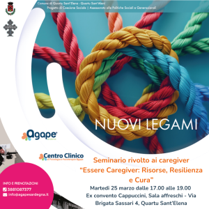 L’evento dal titolo “Essere caregiver: Risorse, Resilienza e Cura” è promosso nell’ambito dei Progetti di Coesione Sociale finanziati dall'Amministrazione del Comune di Quartu Sant’Elena, Assessorato alle Politiche Sociali e Generazionali. L'incontro si rivolge ai caregiver familiari che si occupano di assistere e supportare chi, a causa di una o più patologie, vive una condizione di non autosufficienza.